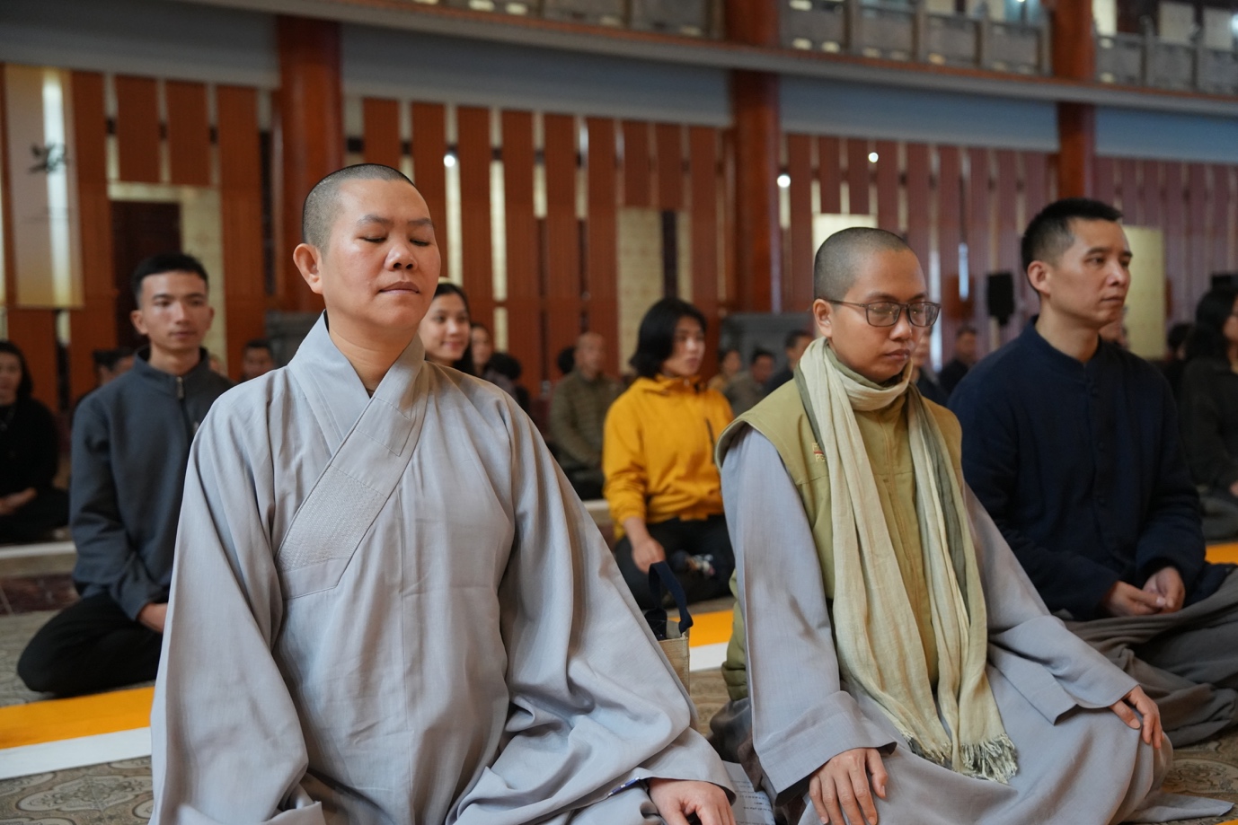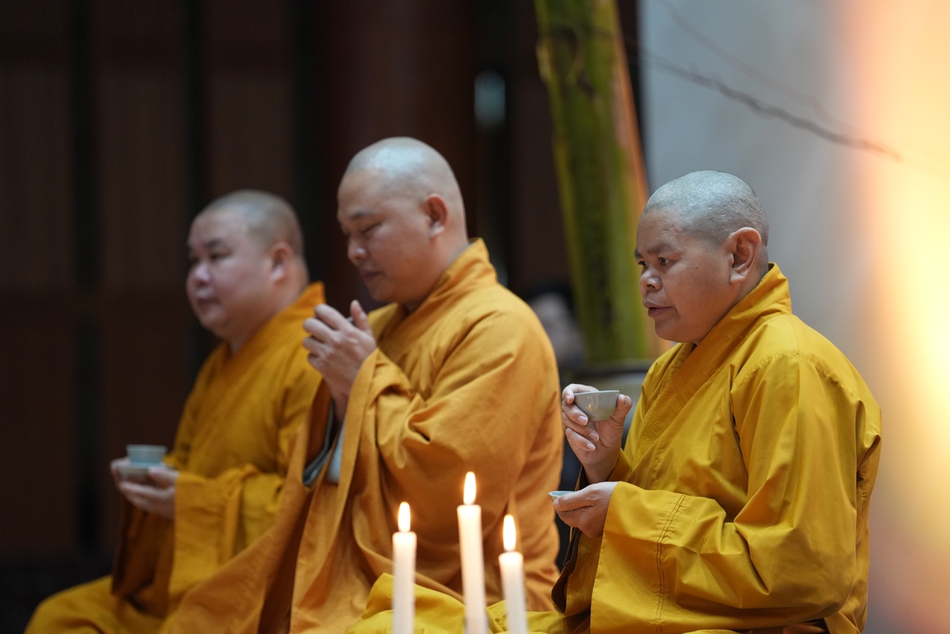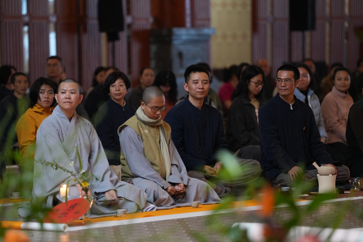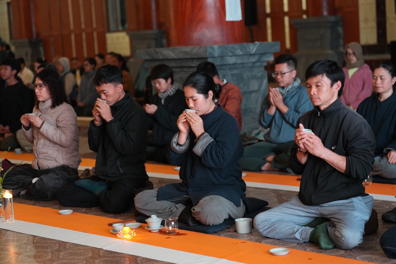 Trong không khí thanh tịnh của buổi trà đạo tại chùa Hưng Phúc, Thượng tọa Thích Thanh Anh và Hòa thượng Thích Đức Tuấn hoan hỷ chia sẻ niềm vui khi ngày càng nhiều người tìm đến với trà như một nếp sống tỉnh thức, trở về sum vầy trong không gian ấm áp của cửa thiền. Giữa hương trà thoảng nhẹ, mỗi người chậm rãi nâng chén, thả lỏng thân tâm, đưa mình trở về với sự an nhiên và tĩnh tại. Trong khoảnh khắc ấy, ta lắng nghe sâu hơn tiếng nói từ nội tâm, cảm nhận rõ hơn nhịp thở và sự hiện diện của chính mình. Trong bầu không khí trang nghiêm mà gần gũi, quý Thầy cùng đại chúng ôn cố tri tân, nhắc nhớ lòng biết ơn và đồng hướng tâm nguyện về một năm mới bình an, tràn đầy chính niệm.