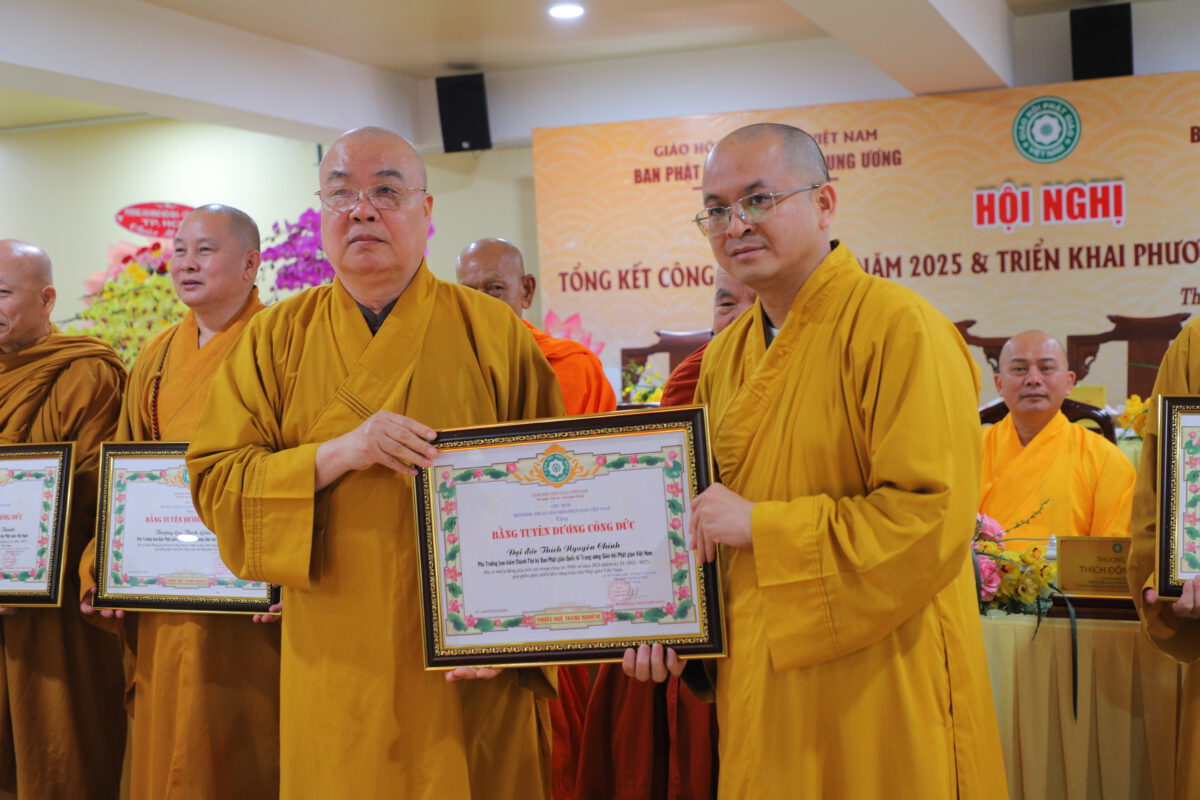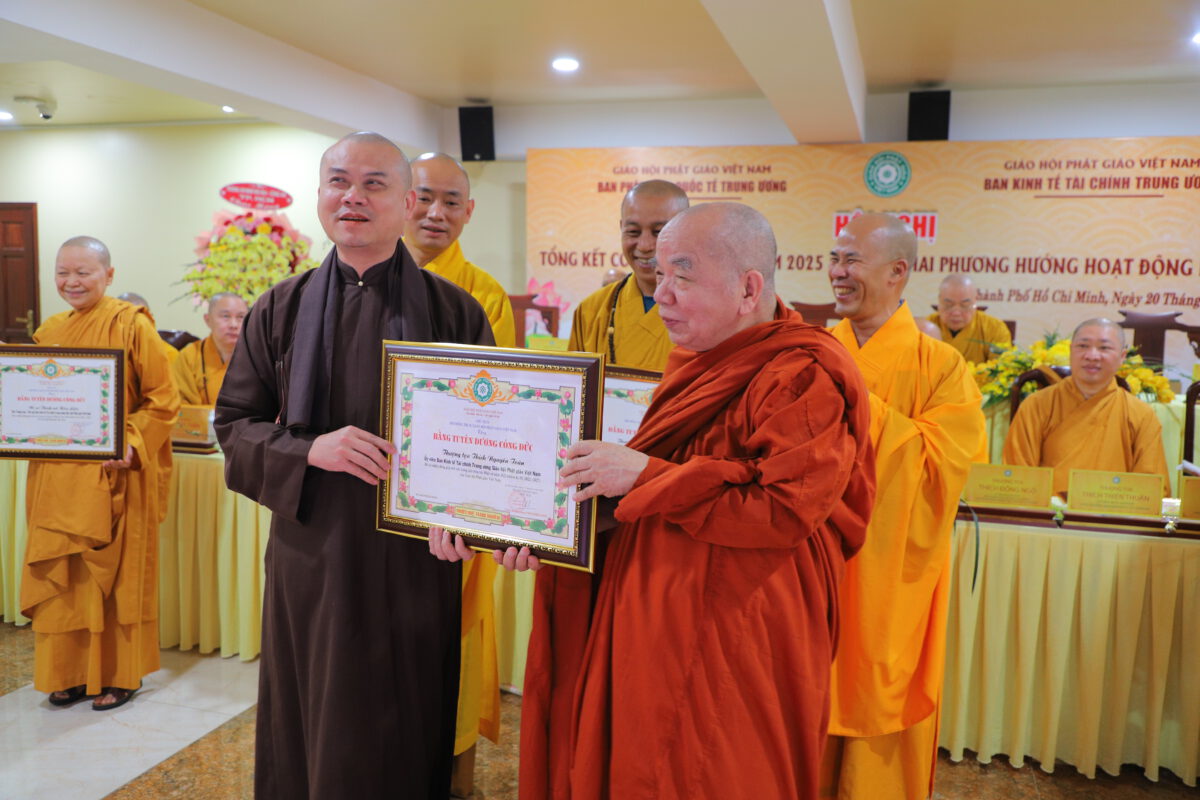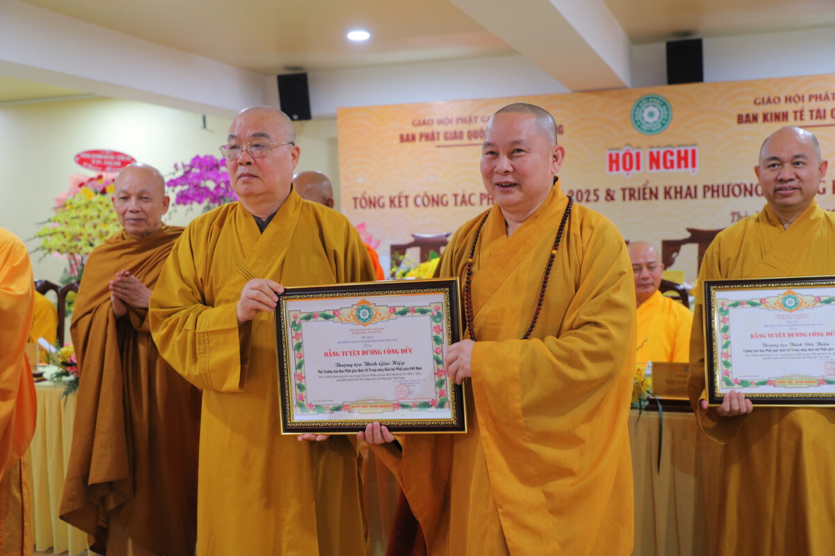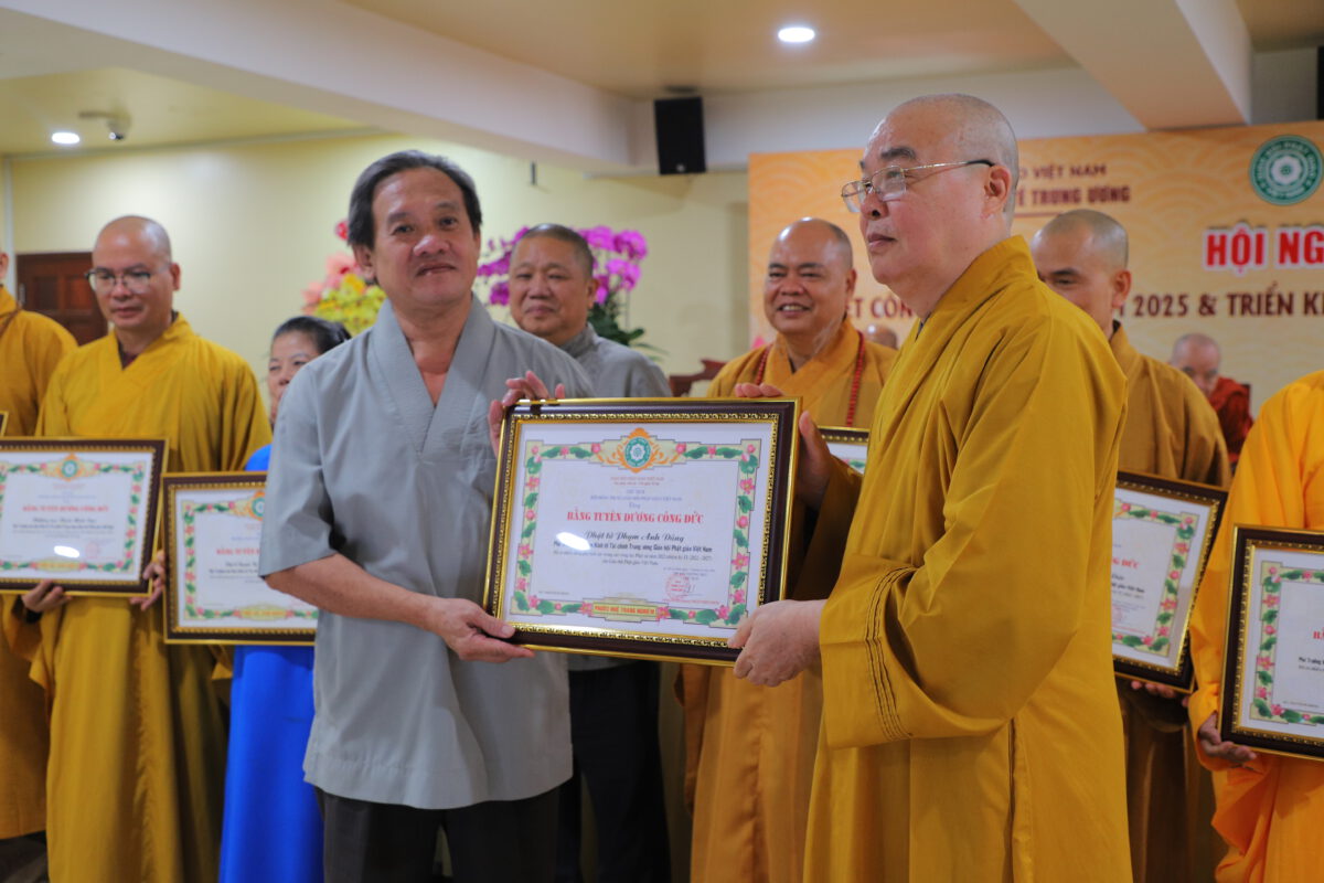 Thượng tọa Thích Thanh Tuấn – Phó Tổng Thư ký Hội đồng Trị sự, Chánh Văn phòng I Trung ương Giáo hội đã công bố Quyết định và điều hành phần trao Bằng tuyên dương công đức của Trung ương Giáo hội. Nhằm ghi nhận và tán thán những nỗ lực, thành tựu đạt được trong năm qua, Hội đồng Trị sự Trung ương GHPGVN đã trao Bằng Tuyên dương Công đức cho tập thể Ban Phật giáo Quốc tế Trung ương và Ban Kinh tế – Tài chính Trung ương, đồng thời vinh danh các cá nhân tiêu biểu có nhiều đóng góp xuất sắc cho sự phát triển bền vững của Giáo hội.