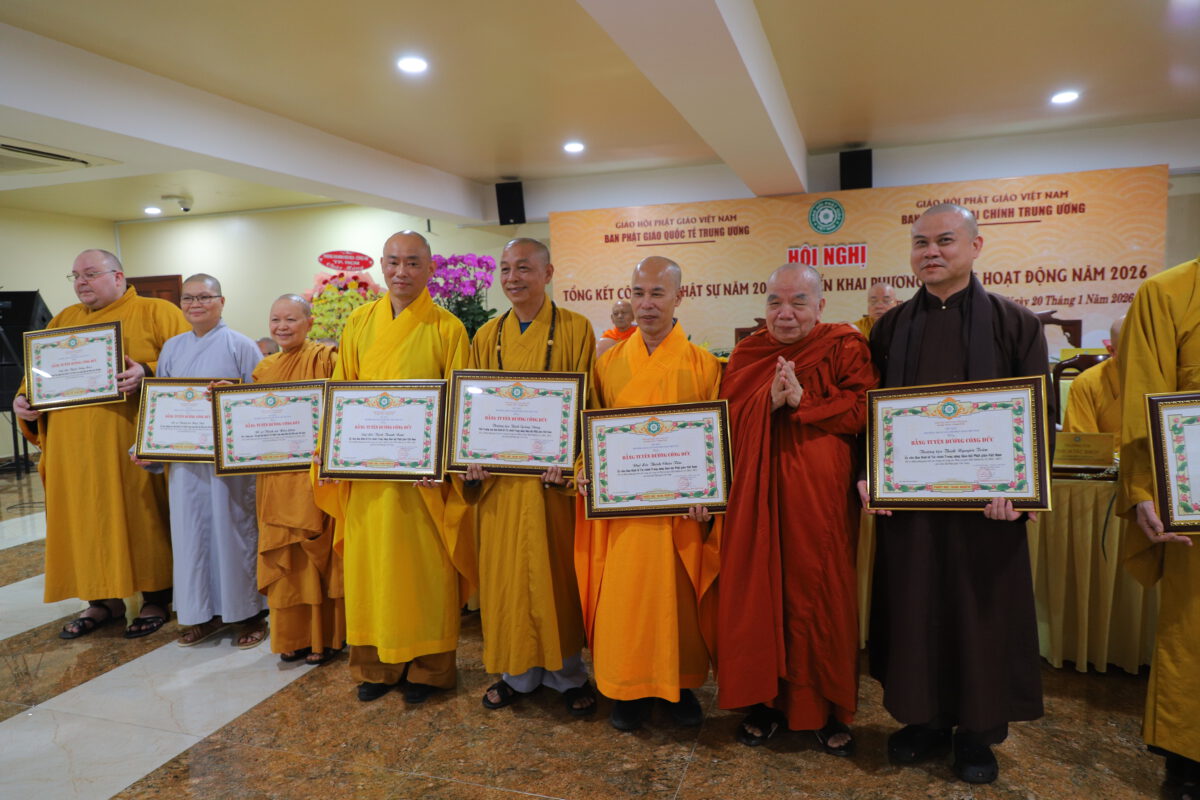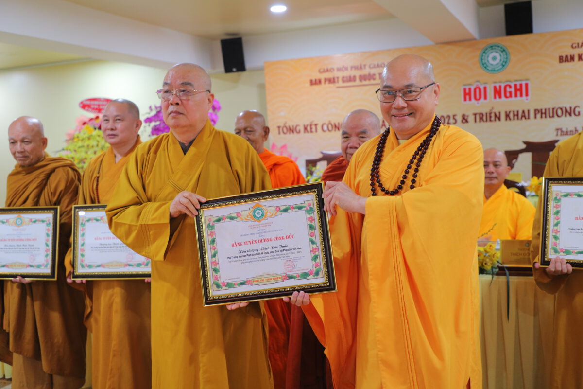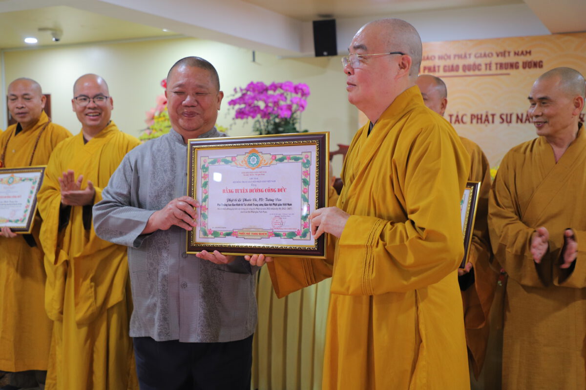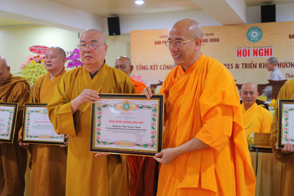 Thượng tọa Thích Thanh Tuấn – Phó Tổng Thư ký Hội đồng Trị sự, Chánh Văn phòng I Trung ương Giáo hội đã công bố Quyết định và điều hành phần trao Bằng tuyên dương công đức của Trung ương Giáo hội. Nhằm ghi nhận và tán thán những nỗ lực, thành tựu đạt được trong năm qua, Hội đồng Trị sự Trung ương GHPGVN đã trao Bằng Tuyên dương Công đức cho tập thể Ban Phật giáo Quốc tế Trung ương và Ban Kinh tế – Tài chính Trung ương, đồng thời vinh danh các cá nhân tiêu biểu có nhiều đóng góp xuất sắc cho sự phát triển bền vững của Giáo hội.