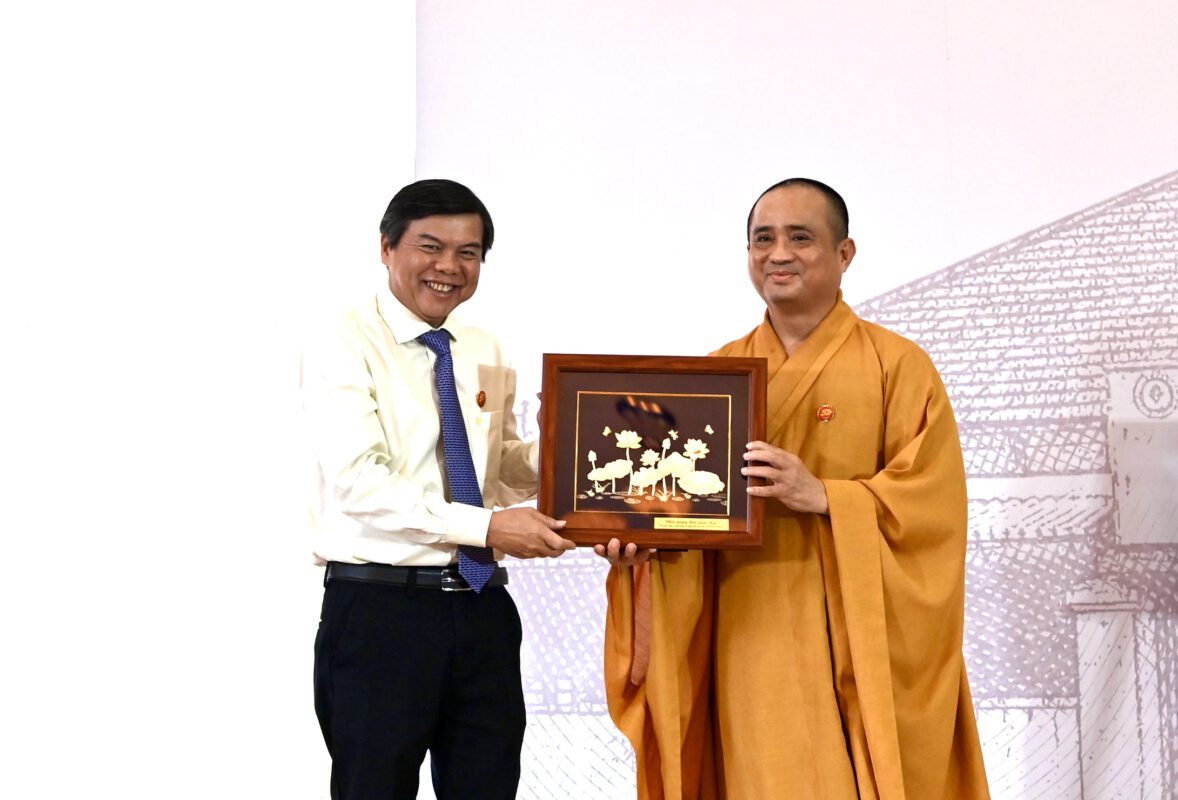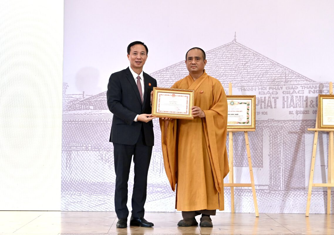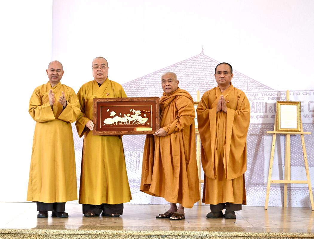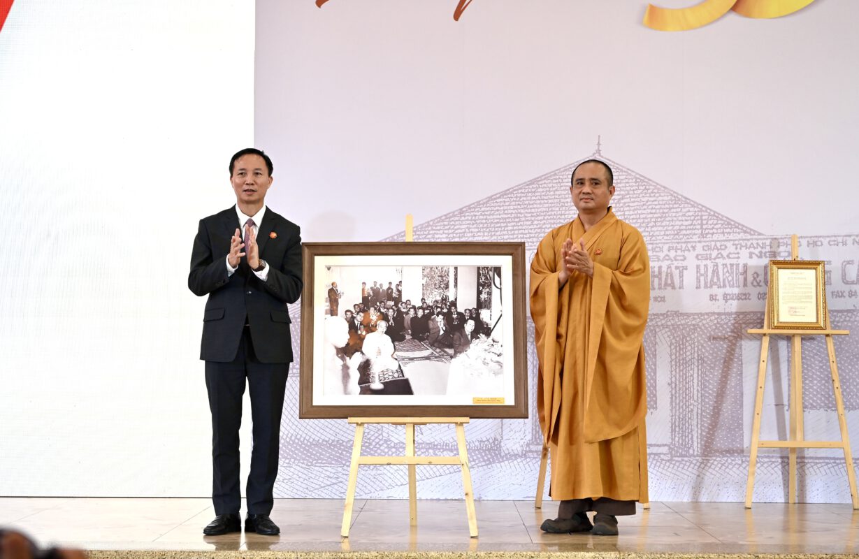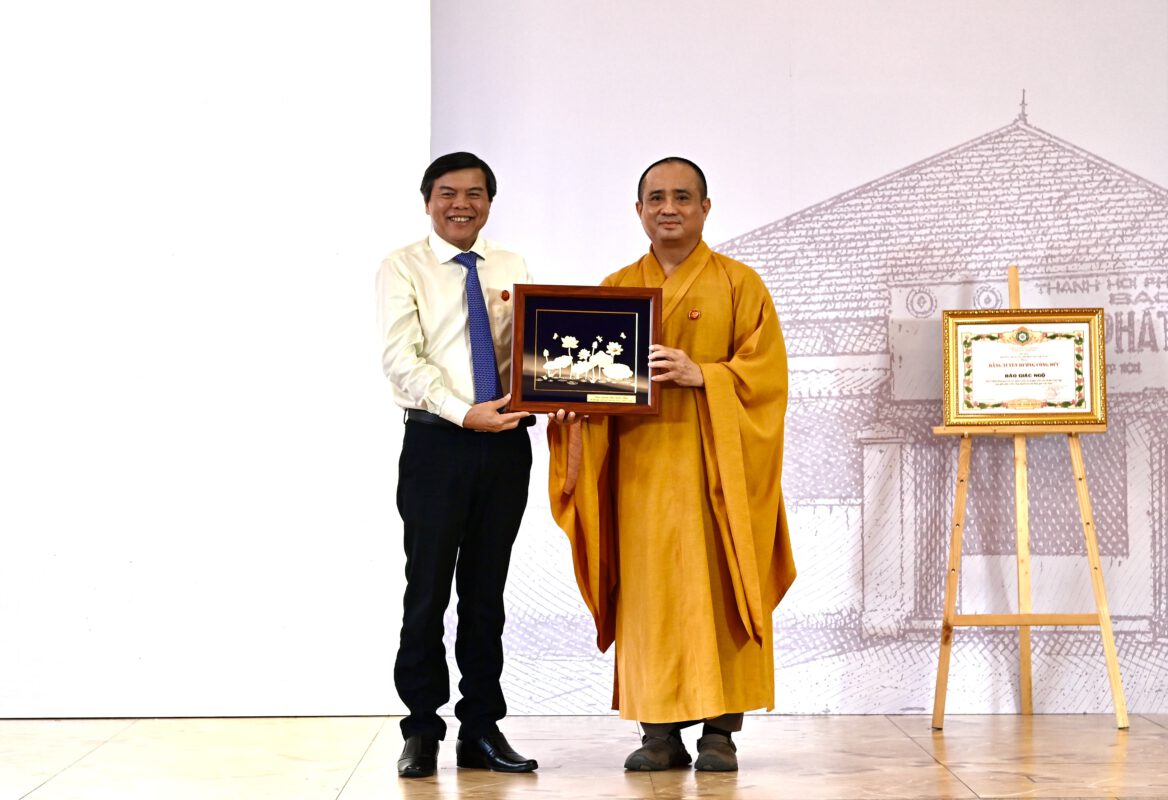 Tại buổi lễ, Đức Pháp chủ GHPGVN đã trao tặng Báo Giác Ngộ tôn tượng Đức Phật hoàng Trần Nhân Tông. Món quà đặc biệt này tôn vinh tinh thần “hộ quốc an dân” và truyền thống Phật giáo dấn thân. Đây chính là giá trị cốt lõi mà Báo Giác Ngộ luôn gìn giữ trong hành trình phụng sự đạo pháp và dân tộc