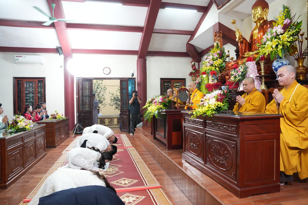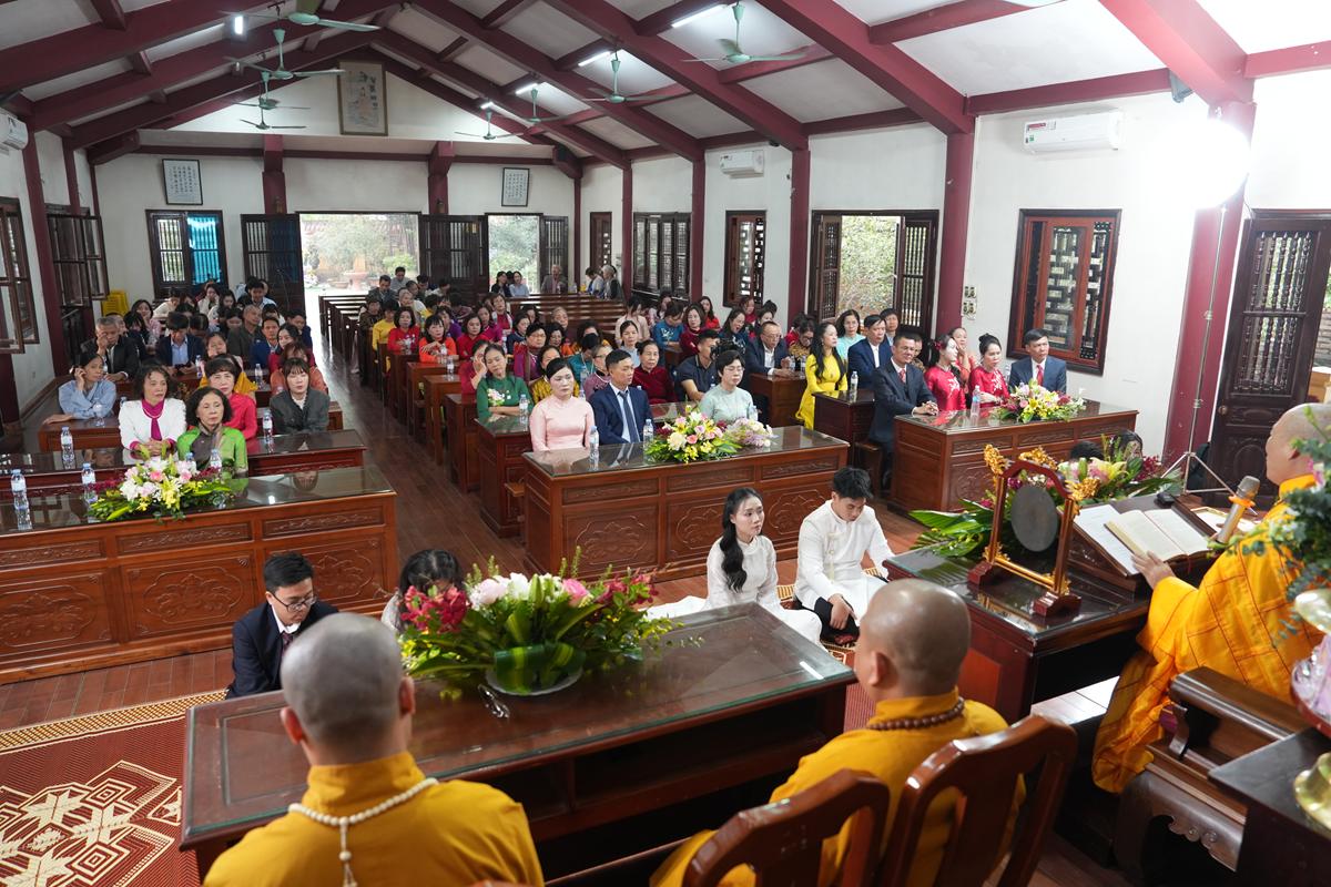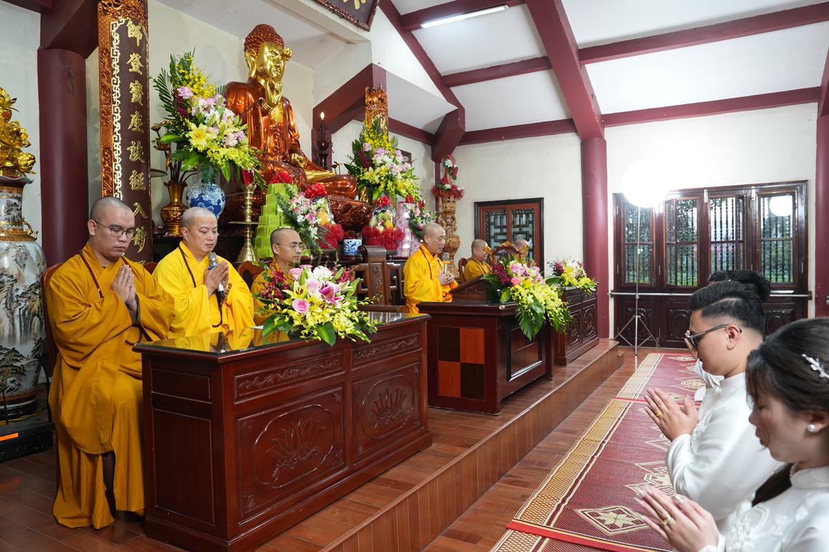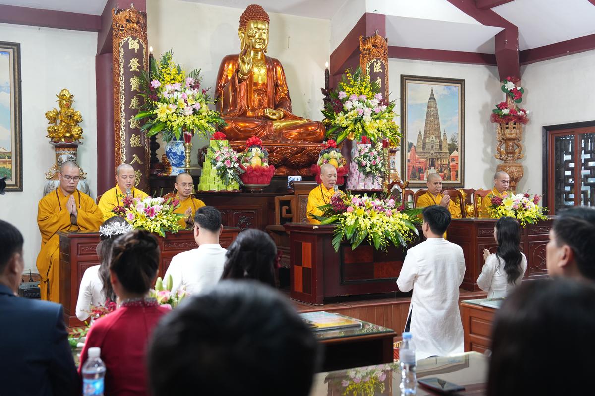 Buổi lễ được diễn ra trang nghiêm trong sự gia hộ của mười phương chư Phật, sự chứng minh của Hòa thượng trụ trì Thích Bảo Nghiêm – Phó chủ tịch HĐTS, Trưởng Ban hoằng pháp TƯ GHPGVN và chư tôn đức Tăng bản tự cùng sự tham dự của họ hàng hai bên gia đình của ba đôi bạn trẻ.