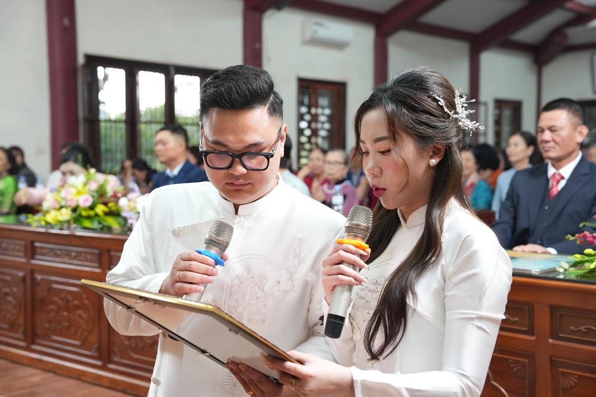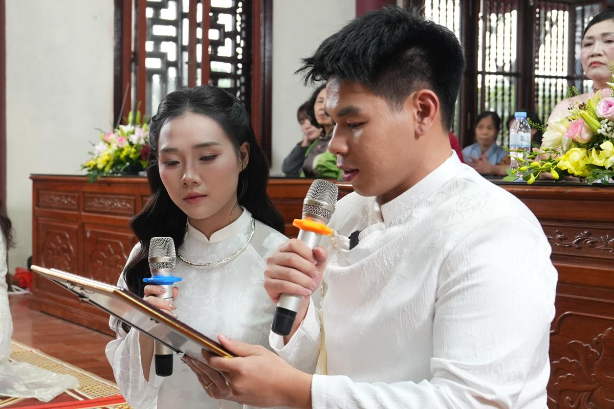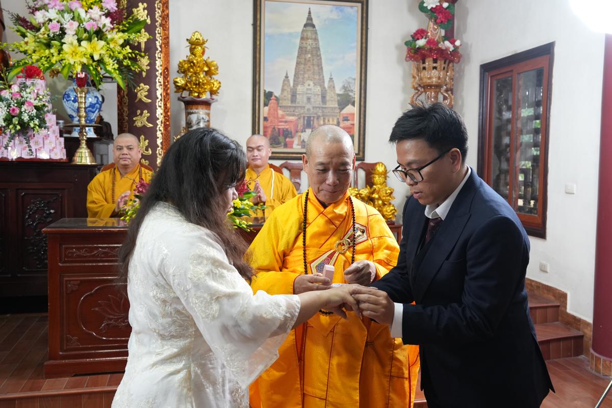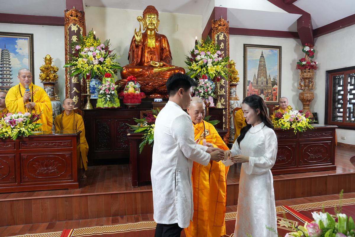 Tiếp theo, ba đôi bạn trẻ đã trao nhẫn cưới cho nhau trước sự chứng minh chúc phúc của chư tôn đức, cùng lễ tạ Tam Bảo, tạ ơn cha mẹ và hành lễ với nhau tôn trọng sự bình đẳng. Trong không gian thiêng liêng, ba đôi bạn trẻ đã đối trước chư tôn đức đọc lời thệ nguyện kết hôn.