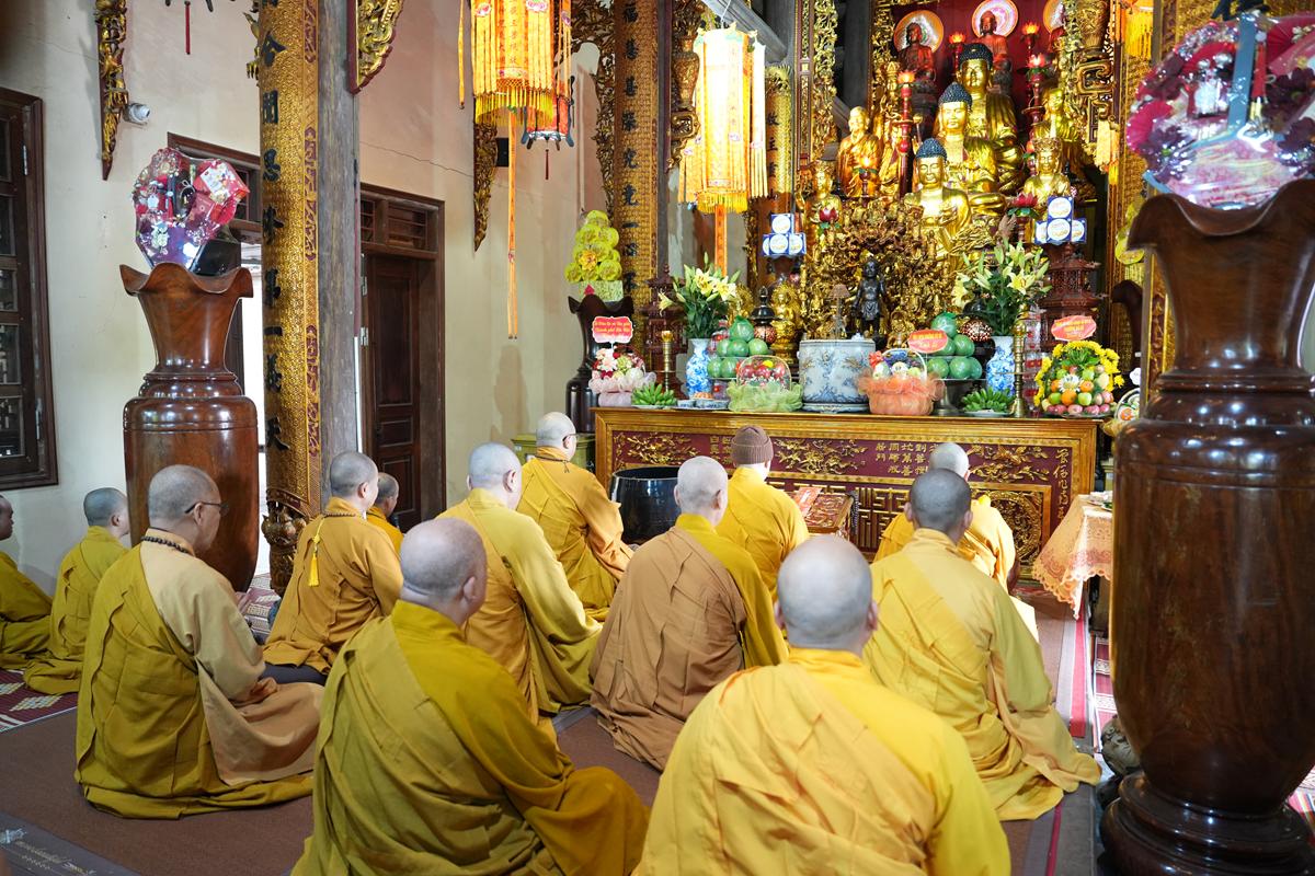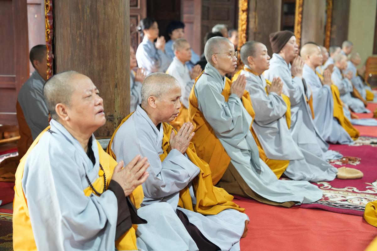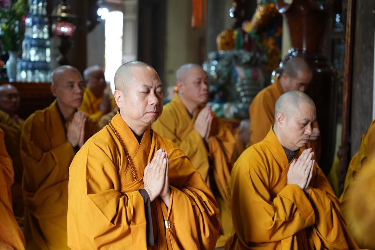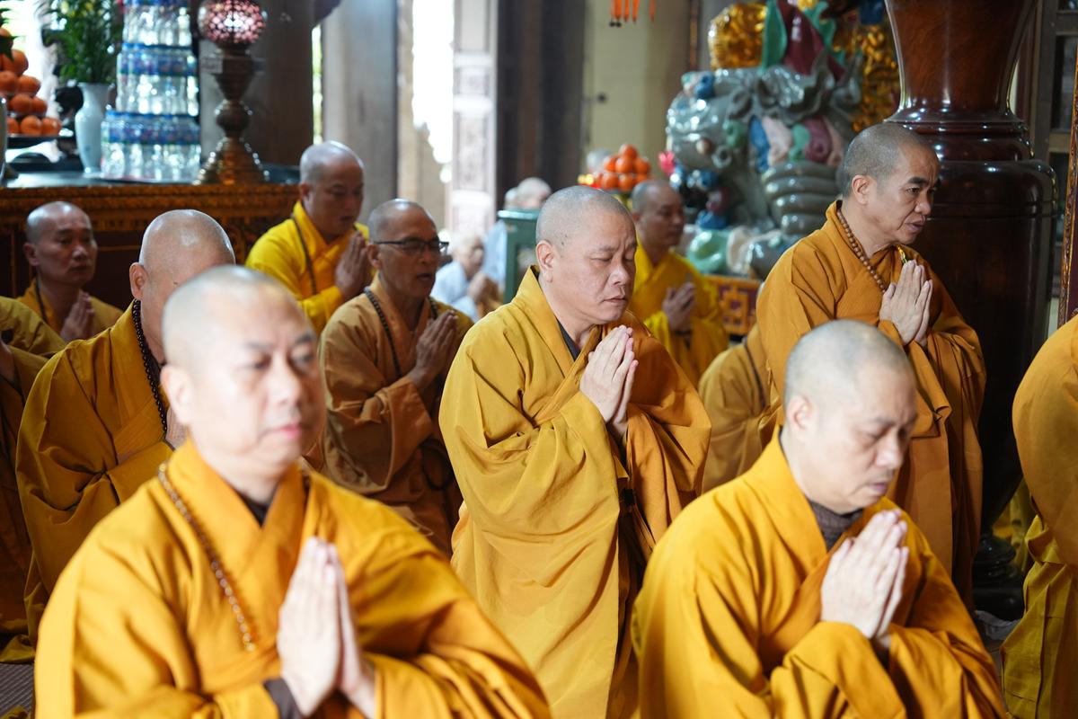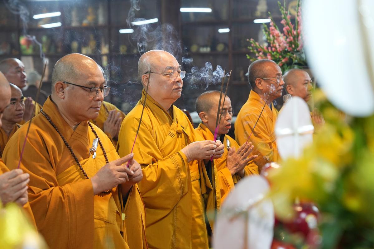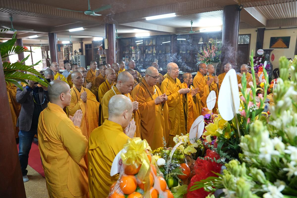 Trong không khí trang nghiêm nơi chốn Tổ, chư tôn đức đã thành kính cử hành nghi thức cúng Phật, cúng Tổ, sau đó vân tập trước Tam Bảo tụng thời Kinh A Di Đà huân tu, nhất tâm hướng lòng tưởng niệm bậc tôn túc khả kính đã trọn đời hiến dâng cho Đạo pháp và Dân tộc. Sau thời kinh, chư tôn đức cùng đại chúng trang nghiêm nhiễu quanh bảo tháp thờ Đức Đệ nhị Pháp chủ, dâng nén tâm hương tri ân và kính ngưỡng trước đạo phong cao khiết của bậc long tượng thiền môn.