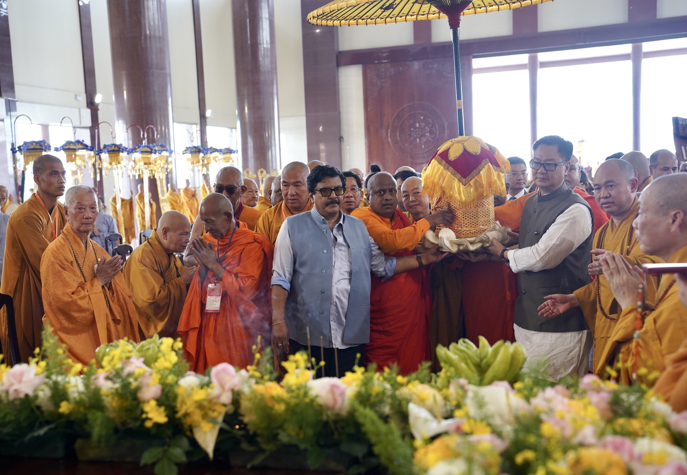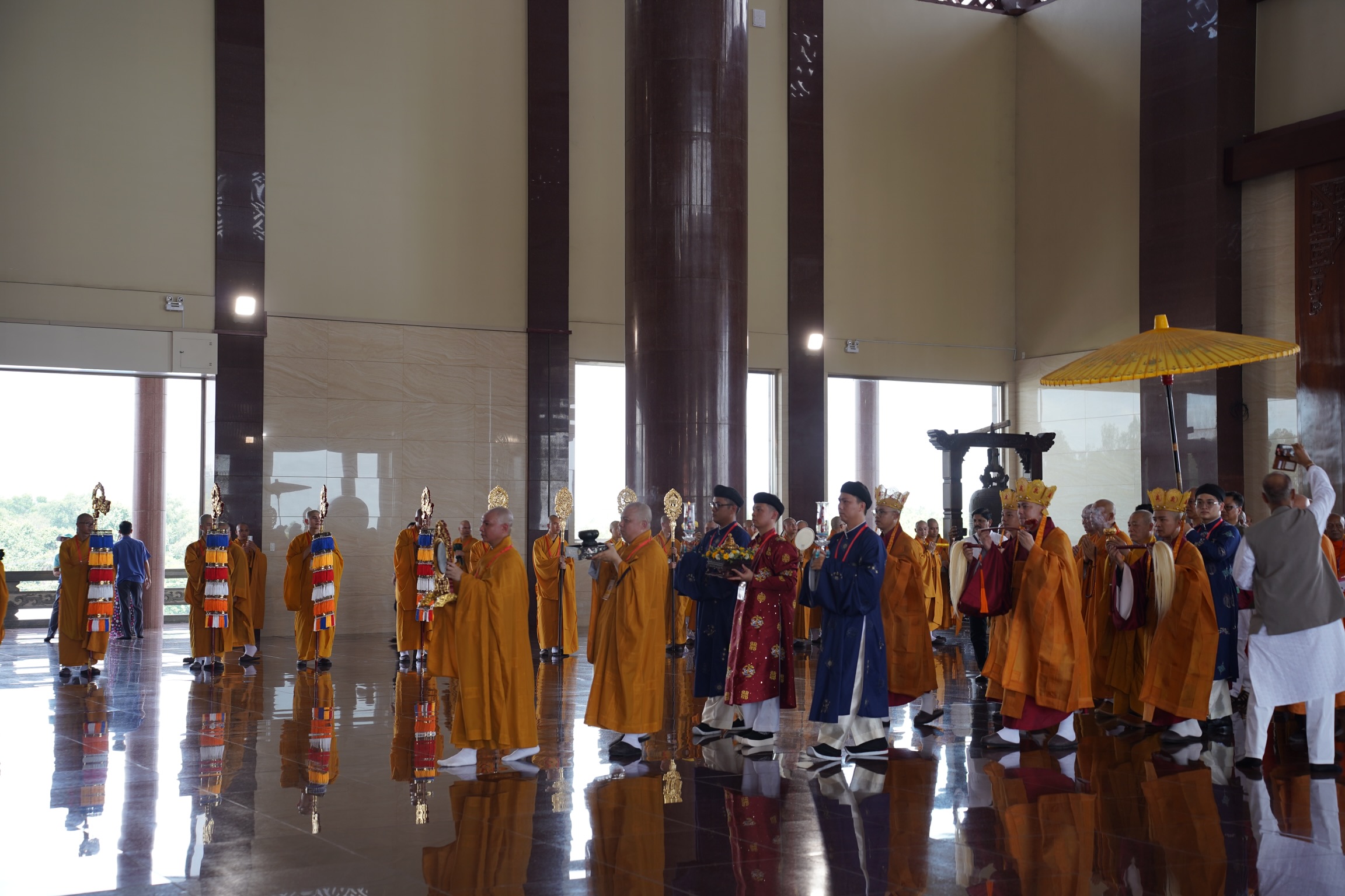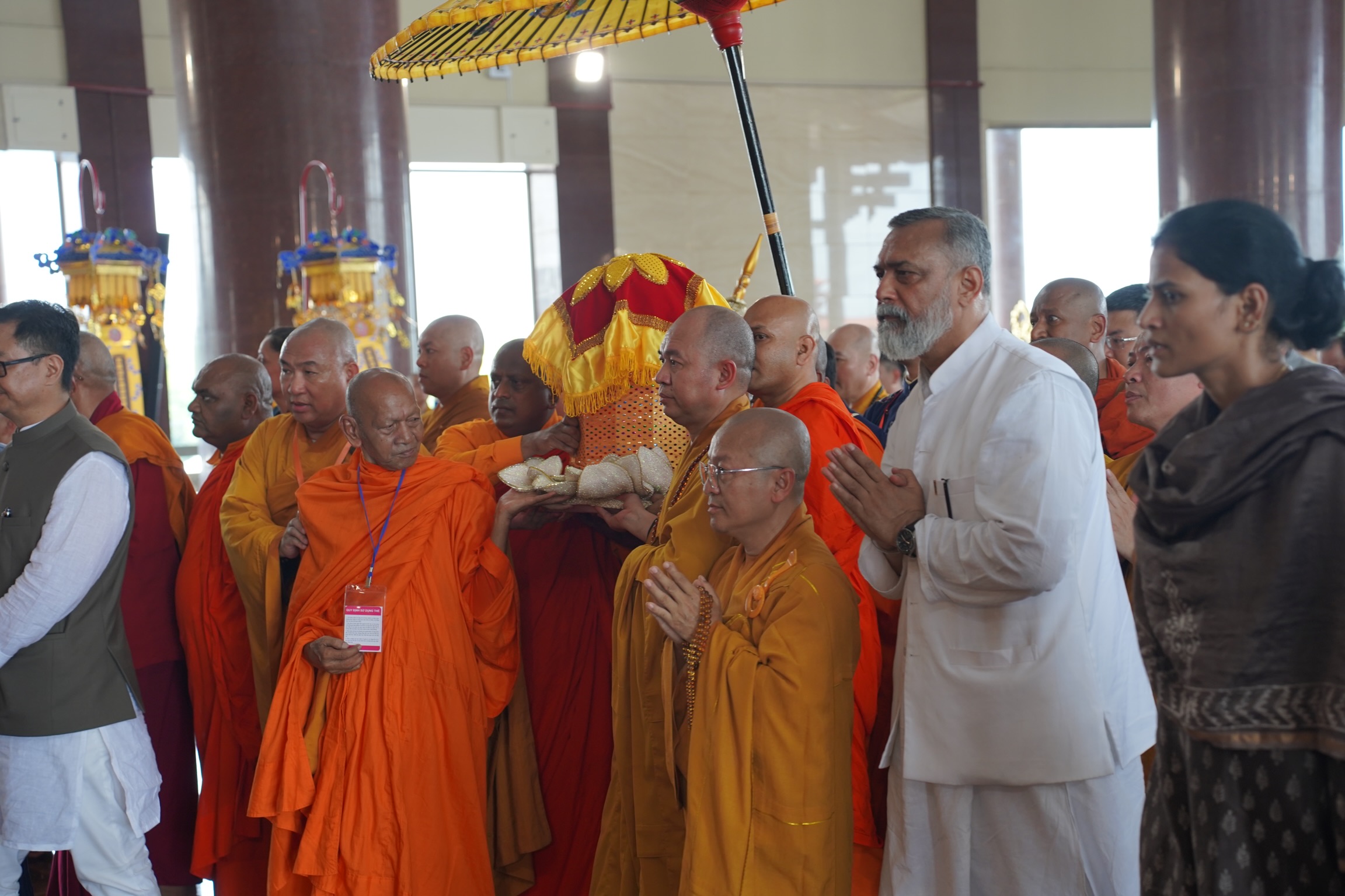 Chủ trì lễ tiếp đón và cung rước Xá-lợi có Đức Đệ tứ Pháp chủ – Đại lão Hòa thượng Thích Trí Quảng và Đức Phó Pháp chủ Hội đồng Chứng minh kiêm Chủ tịch Hội đồng Trị sự – Trưởng lão Hoà thượng Thích Thiện Nhơn cùng chư Tôn đức Giáo phẩm GHPGVN, đại diện Chính phủ, đoàn chuyên gia Ấn Độ cùng sự hiện diện của đông đảo Tăng Ni với pháp khí, nhạc lễ cổ truyền, cờ lọng và đoàn Phật tử dâng hoa, tất cả cùng hòa chung lòng tôn kính Đức Thế Tôn.