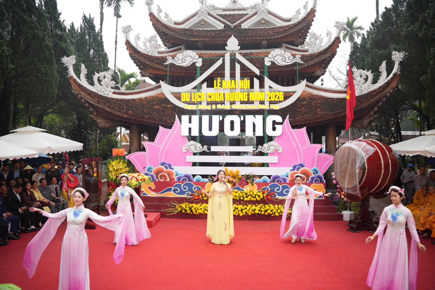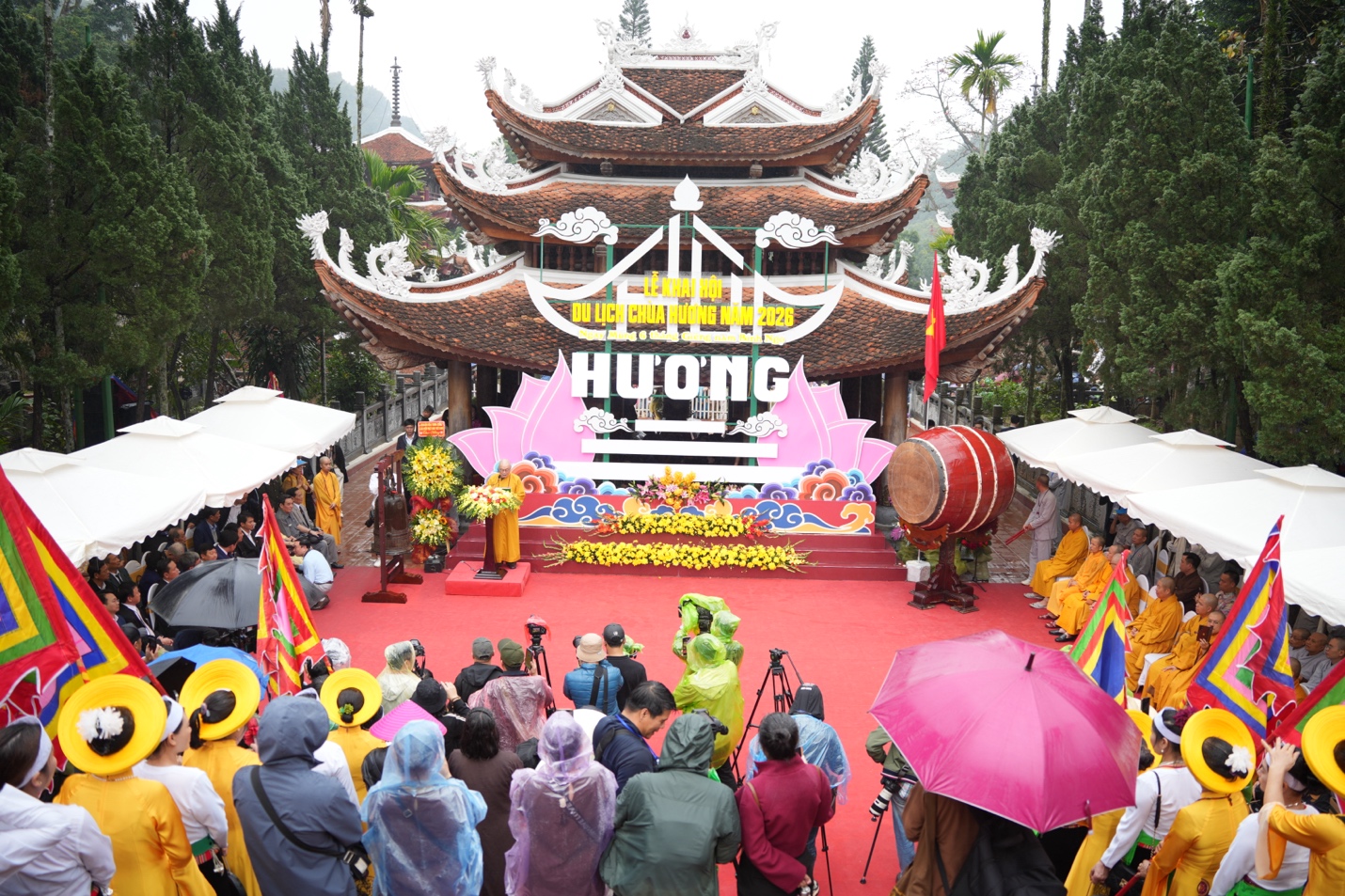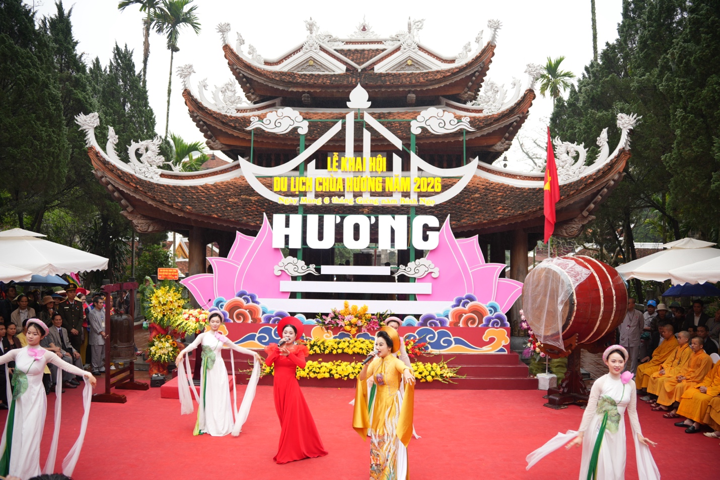 Lễ khai hội được mở đầu bằng tiết mục Trống hội Thăng Long và chương trình nghệ thuật chào mừng, hòa quyện giữa âm hưởng văn hóa truyền thống và tinh thần Phật giáo. Với chủ đề “An toàn-thân thiện-chất lượng”, Ban tổ chức lễ hội chùa Hương năm nay chú trọng tăng cường kỷ cương, văn minh lễ hội; bảo đảm an ninh trật tự, an toàn giao thông, vệ sinh môi trường; đồng thời, nâng cao chất lượng dịch vụ, tạo thuận lợi cho nhân dân và du khách thập phương tham quan, chiêm bái.