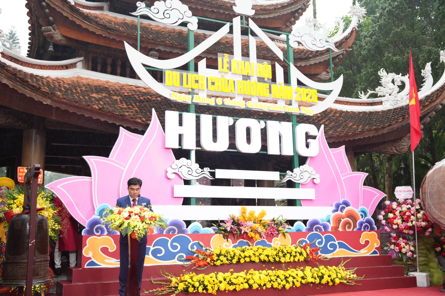 Phát biểu tại lễ khai hội, Chủ tịch Ủy ban nhân dân xã Hương Sơn – Ông Lê Văn Trang cho biết, việc tổ chức Lễ hội chùa Hương năm 2026 theo hướng đổi mới tư duy và cách làm không chỉ nhằm tổ chức một mùa lễ hội an toàn, thân thiện, chất lượng mà còn đặt nền móng cho phát triển bền vững khu di tích trong giai đoạn tiếp theo.